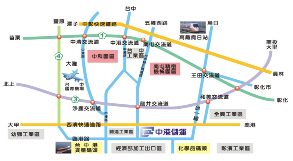 中港儲運有限公司座落於龍井關連工業區,身處中部交通要道之核心交匯處,交通便捷,緊臨台中港、國道交流道(